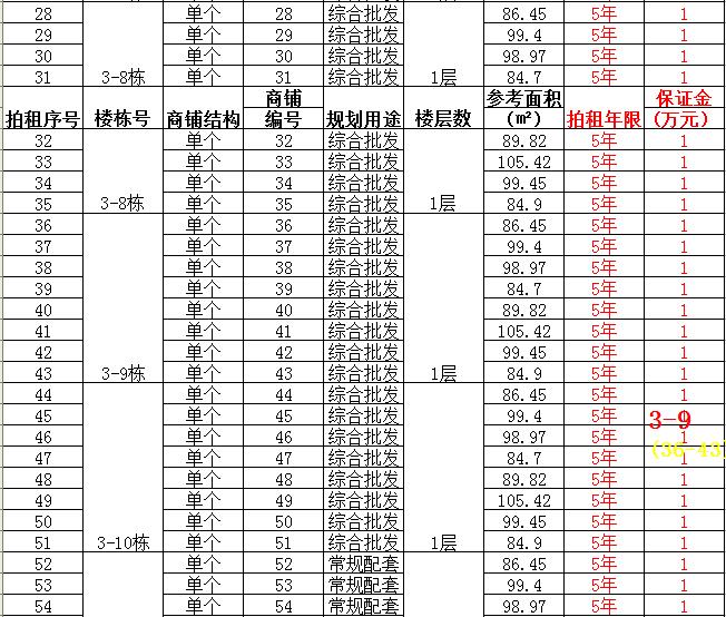 (二)拍租二個(gè)及其以上合并為一個(gè)商鋪6間,使用期5年,每間商鋪預(yù)交競(jìng)租保證金2萬元至3萬元不等,詳見商鋪簡(jiǎn)介(欲競(jìng)租多間商鋪,保證金類推)。